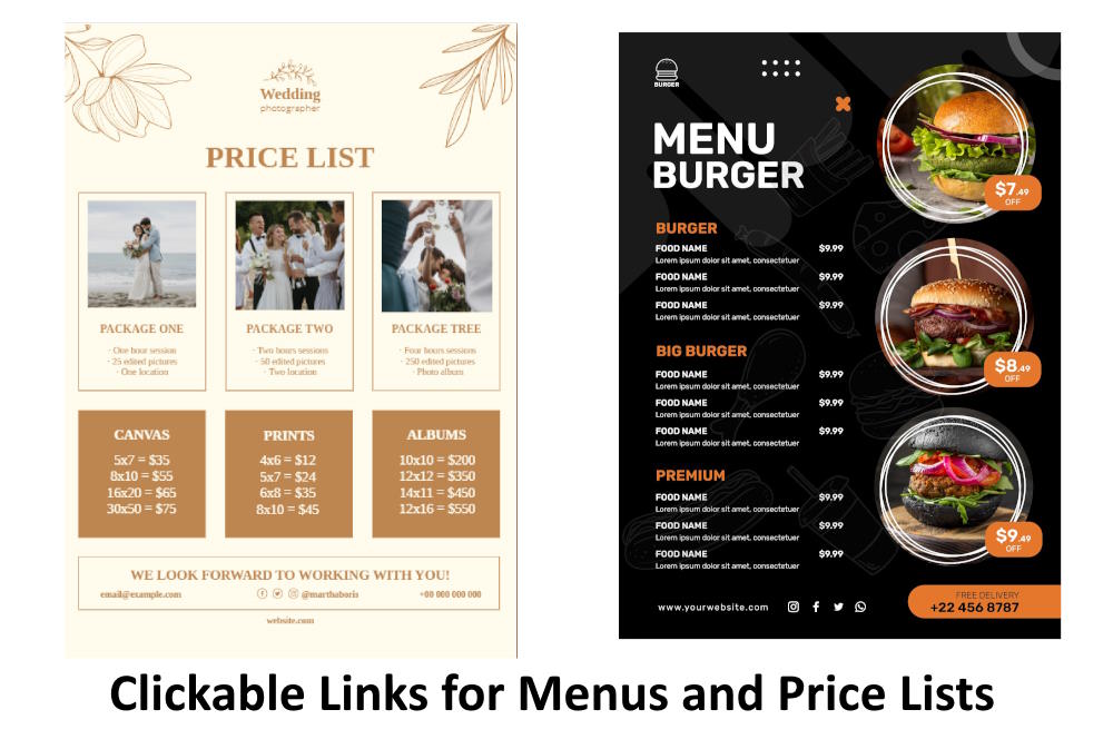 For business or individuals that would like to display their price lists, we can accomodate that. Food establishments may display their menus or link to existing menu pages the business has. (See Restaurant Listings)